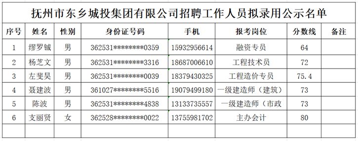 抚州市东乡城投集团有限公司招聘工作人员拟录用公示
